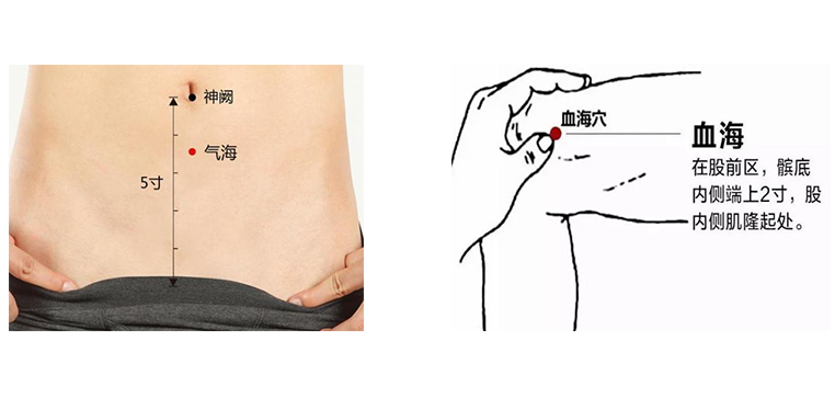 ●血海:拇指置于血海穴上,停止節律性按壓揉動,以酸脹感為度。